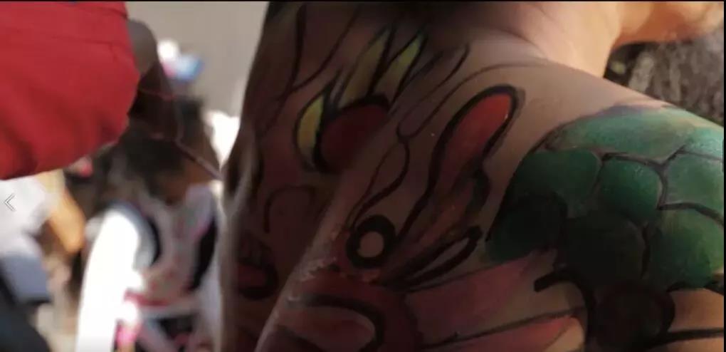 “大哑巴”身上仅着羊皮短裤,头戴插有长长锦鸡毛的牛皮头饰,胸前绘黄龙,龙头高昂,腿上绘黄龙身,后背绘青龙抢宝,手臂上绘青龙身。“中哑巴”里,男子身穿羊皮褂和羊皮短裤,脚穿绣花凉鞋;女子穿彝族绣花服饰,脚穿绣花毛边底布鞋。“中哑巴”脑门要画太阳,男子画黄心黑边红光太阳,女子画红心白边白光太阳,此外,男子胸前画牛头,手臂上画女性生殖器官,膝盖画女性乳房。“小哑巴”由村里的孩童扮演,化妆只在脸上和手上涂抹锅烟。在节日中,“小哑巴”们给八方来客涂抹烟灰,被涂抹越多的客人表示越受欢迎。