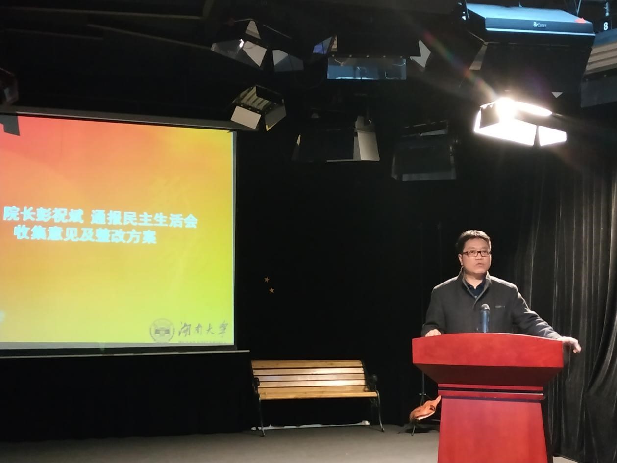 院长彭祝斌通报了院领导民主生活会收集的意见及整改方案。2018年,院党委共收到意见建议十三条,涉及教学工作、实验室管理等多方面,彭院长对此一一做了回复和解释。此外,彭院长指出大学教师讲政治要注意两个方面:一要上接天线,强化“四个意识”、坚持“四个自信”、做好“两个维护”;二要下接地气,要有责任担当,做好人才培养工作,抓好教学、科研两个抓手。