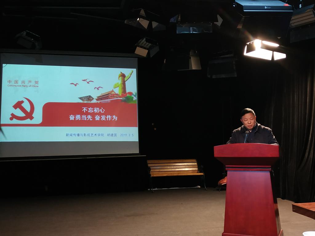 学生支部书记分享结束后,胡书记给全体党员上了一堂主题为《不忘初心奋勇当先奋发图强》的党课。他首先传达了全国高校安全工作电视电话会议、学校关于意识形态工作会议的精神及要求,强调“稳定压倒一切,安全一票否决,要守好安全稳定这条底线,维护政治安全”。