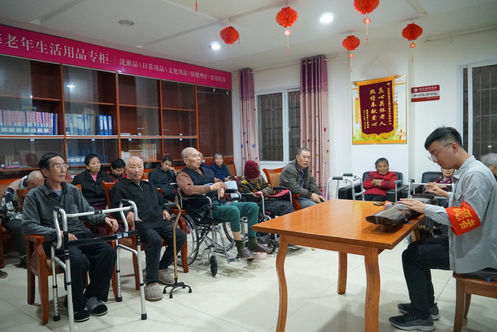 的古琴演奏志愿者为老人们进行古琴演奏。活动在古琴的演奏声中开始,尽管很多老人有着一定程度的听力障碍,但他们仍然认真聆听古琴演奏,有的老人甚至跟随伴奏轻轻哼唱。