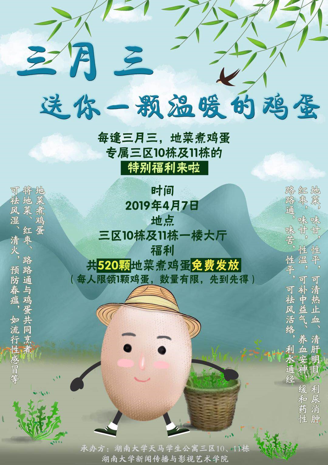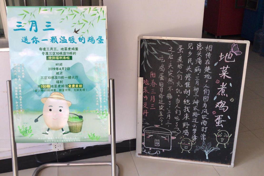 天马学生公寓3区10-11栋主办,新闻传播与影视艺术学院协办的“三月三,送你一颗温暖的鸡蛋”活动准时开启。为弘扬中华优秀传统文化,营造良好园区氛围,向无法回家的同学送上温暖,园区生活老师、宿管阿姨为3区10-11栋同学准备了520颗营养丰富的地菜煮蛋,在楼栋大厅免费发放。