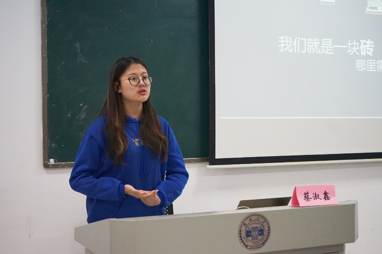 第二位分享人是心理部部长邓鹏,他用详尽的PPT为大家介绍了自己的工作心得,以及对在座干部们的要求与期许。在谈论到自身的工作心得时,邓鹏指出一定要了解工作概况与关键细节、流畅开展工作任务以及要努力锻炼自己的交流协商、情商思维能力;而在讲到对大家的期许时,邓鹏则对大家提出了众多工作细节要求,以及要更好地待人接物,对他人宽心态、多交流、学会谨言慎行等。他在讲话最后总结了自身工作方面的缺点,向在座学生干部推荐了《你自以为的极限,只是别人的起点》这本书,勉励大家共同进步。