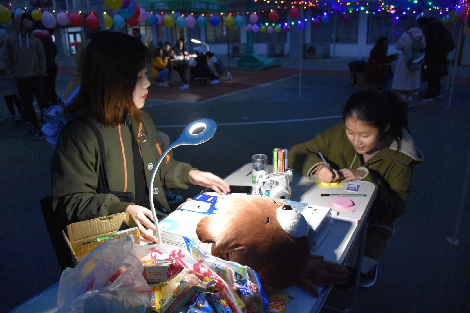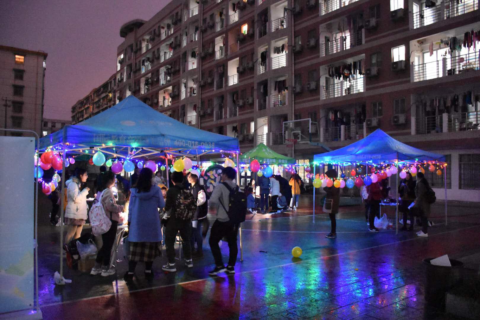 经过工作人员的认真准备,活动场地被精心布置为四个活动区域:兑奖区、品尝区、游戏区、手作区。夜幕之下,被气球和彩灯装点的场地另有一番风味。不少同学专程结伴参加此次活动。