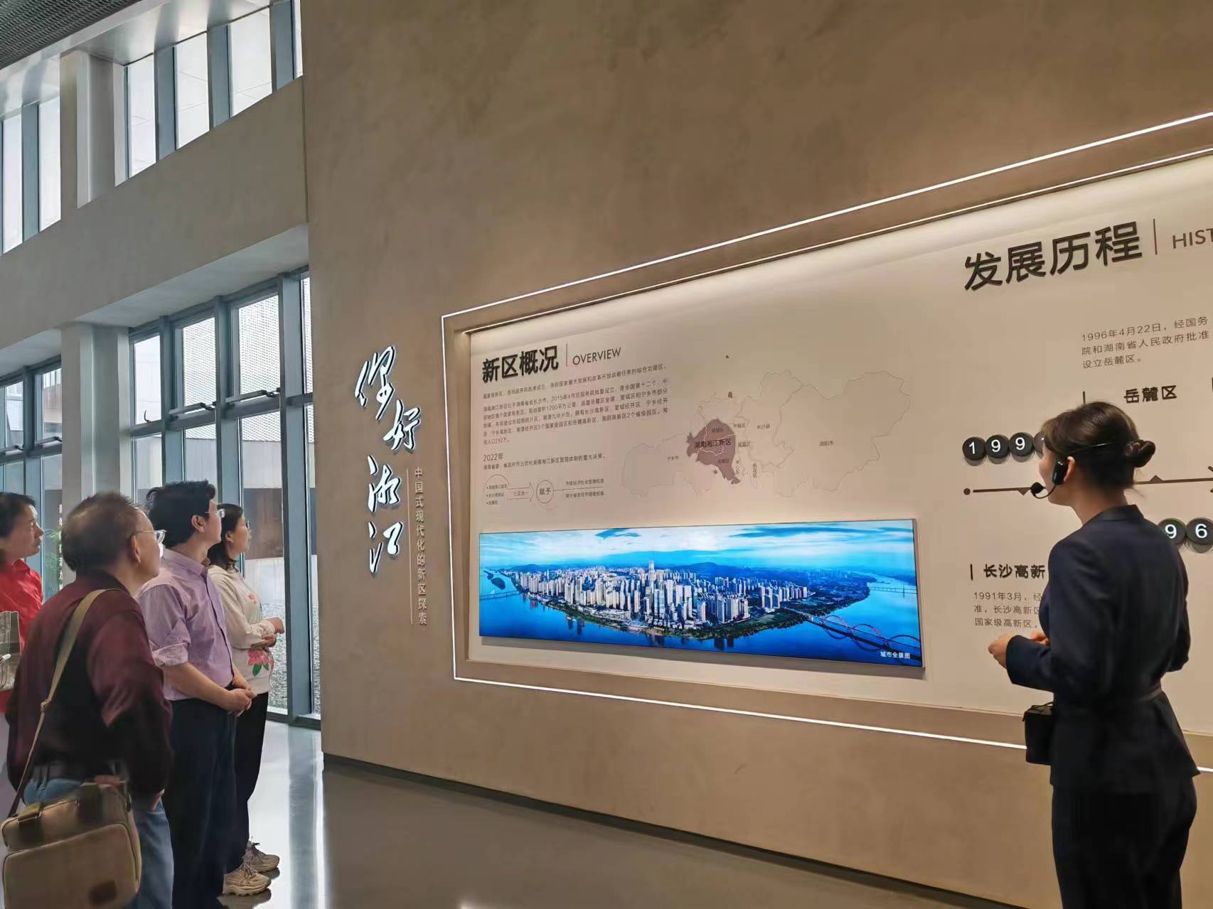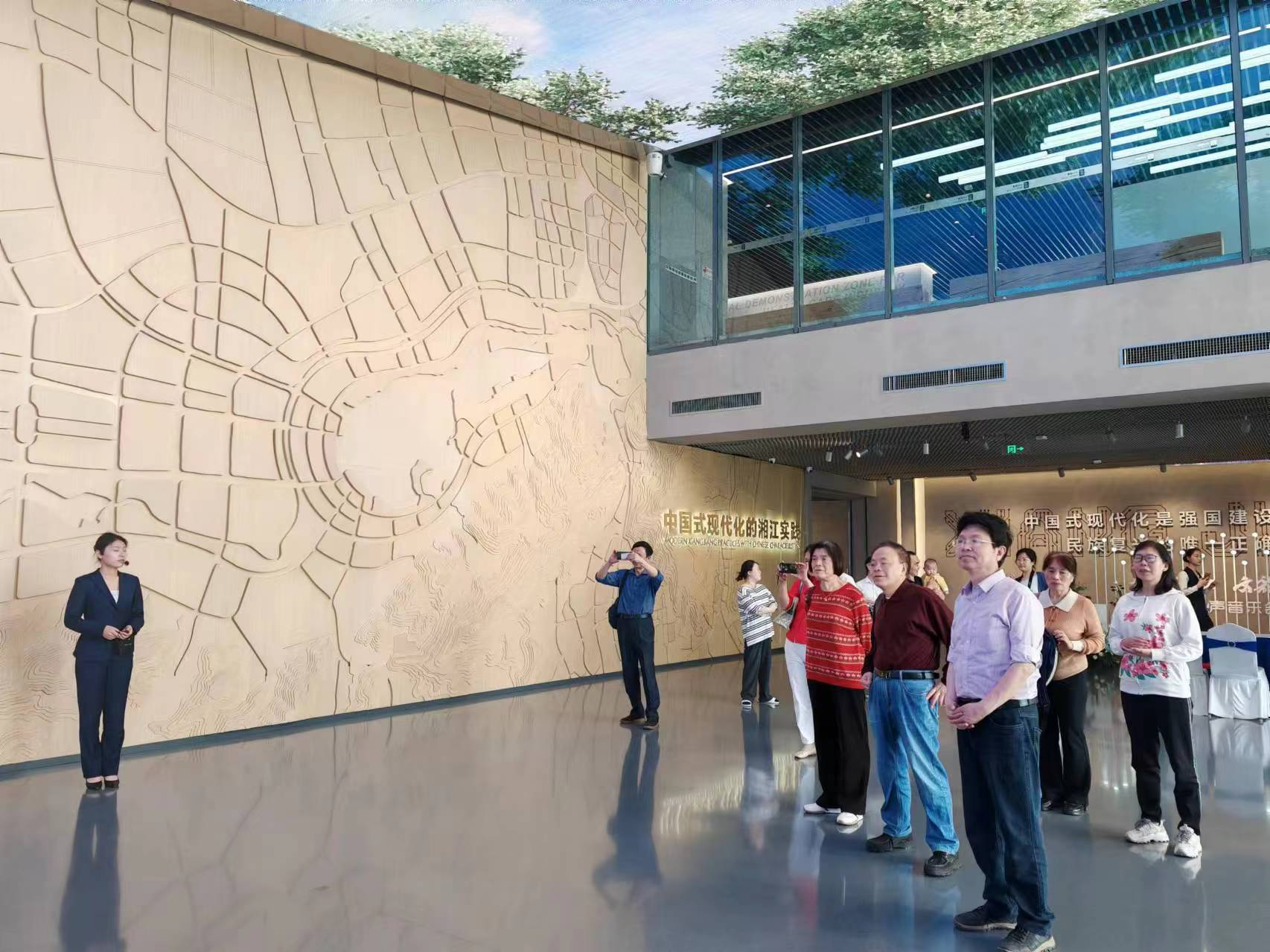 活动第一站是“湘江新区城市馆”,在讲解员的带领下,大家饶有兴致地观看了布展面积达6400平方米的《湘江潮涌向未来——中国式现代化的湘江实践》专题展览。该展览分为“你好湘江”“动力新区”“匠心城市”“向往未来”四个主题展厅,集中展现了湖南湘江新区作为全国第十二个、中部地区首个国家级新区,不断探索中国式现代化的发展路径以及未来续写高质量发展新篇章的宏伟蓝图。