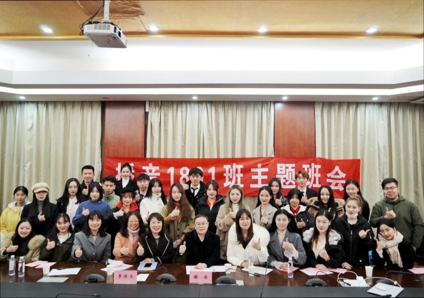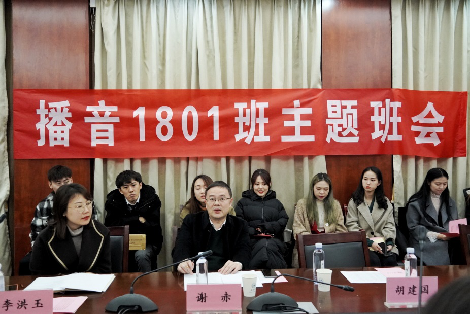副校长谢赤,新传院党委副书记李洪玉,学工办主任、18级辅导员刘佳,播音1801班班主任梅慧,播音1801班全体同学出席会议,会议由播音1801班李东泽、王嘉琪主持。