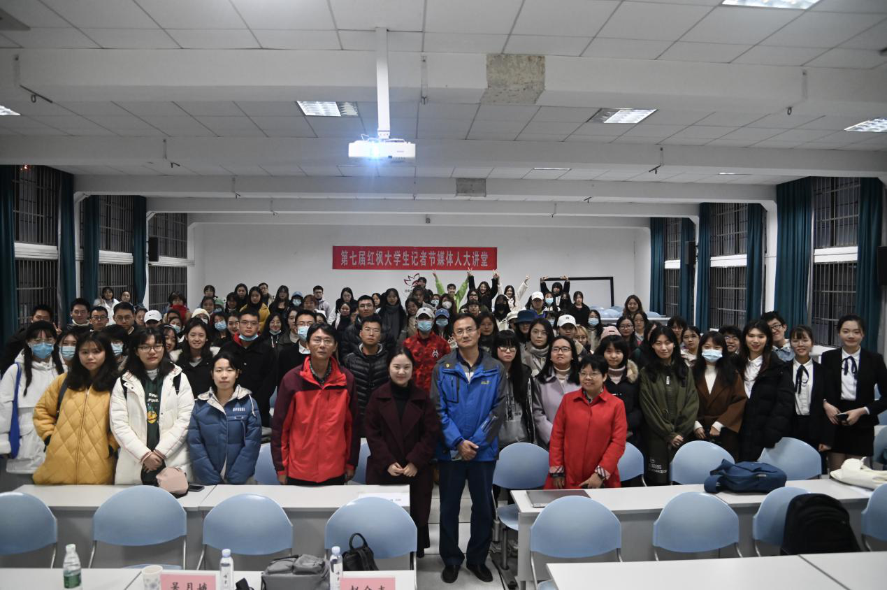 这是第七届全国红枫大学生记者节媒体人大讲堂第二期。身著蓝黑冲锋服、头戴加框眼镜的新华社记者赵众志,以自己的切身经历和图片案例,详解了“真实是新闻的生命”要义。