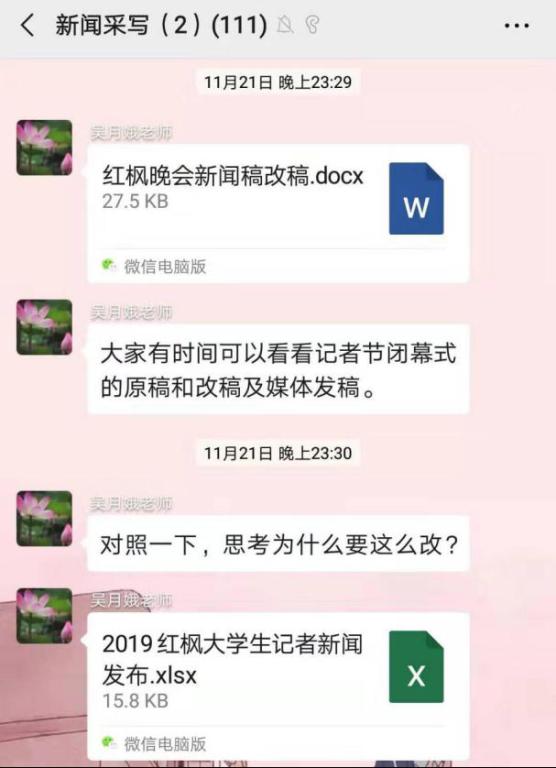 今年由新闻传播与影视艺术学院主办的第六届红枫大学生记者节结束后,2017级新闻班的何思妍也收到了吴老师的指导和鼓励。“当时我正在刷手机,突然就收到了吴老师的消息”,起初,还“吓了一跳”,交流之后才明白吴老师的用心。原来,此前何思妍个人认为还不错的作品,这次在记者节上连优秀奖都没评上的。记者节获奖结果公布后,吴老师一一分析了未获奖的优稿,并与学生作者仔细分析原因。