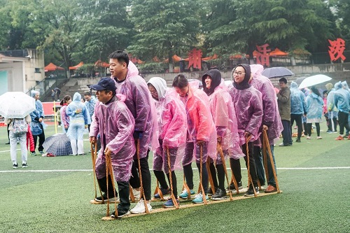 运动会第三个比赛日来临,上午的项目包括男女团体原地抛实心球、踢毽子、携手并排跑、教师集体木鞋比赛,下午则是集体趣味项目和个人项目的比拼。场外风雨交加,场内新影健儿士气不减。