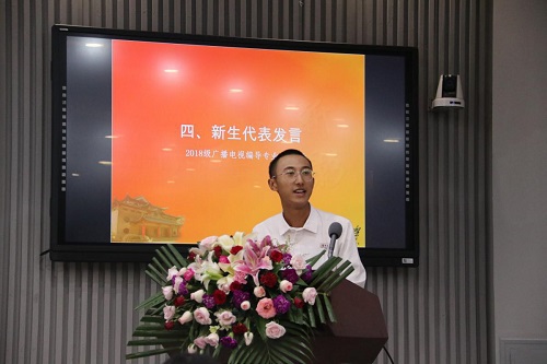2018级编导班彭章冰同学作为新生代表发言。江山代有才人出,各领风骚数百年。“江山如此,湖大亦然。只要地球依旧围着太阳转,只要江海不会倒流,只要夜晚的星空依旧闪烁,只要长沙的臭豆腐依然好吃,湖大学子必将生生不息,与日月争辉!”听了彭同学幽默风趣又激动人心的话语,大家反响热烈,给予阵阵掌声。