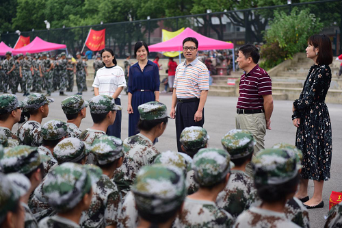9月13日上午,新闻传播与影视艺术学院院长彭祝斌、党委书记胡建国、党委副书记兼副院长程华、院长助理谢莹及18级辅导员刘佳深入军训场地向教官和新生表示慰问。