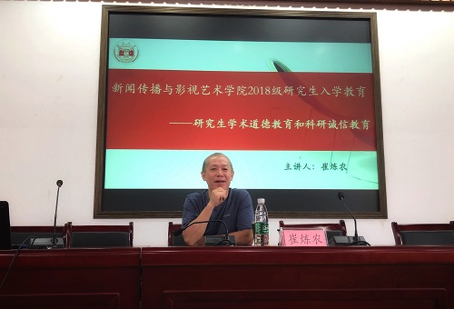 新闻传播与影视艺术学院2018级研究生入学教育——研究生学术道德教育和科研诚信教育专题报告会在北楼217报告厅举行,本次讲座由崔炼农教授主讲,新影学院2018级全体研究生参加。