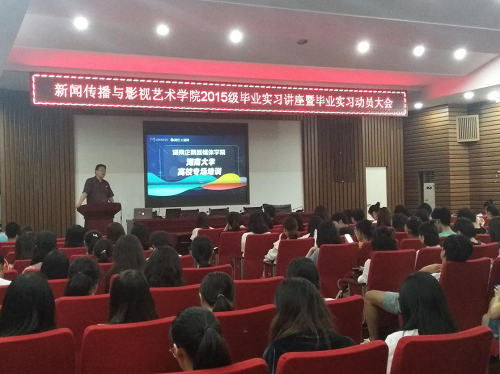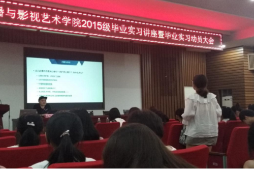 6月22日下午新闻传播与影视艺术学院2015级毕业讲座暨毕业实习动员大会在北楼217召开,会议由新影院实践办公室主任谢伦副教授主持,来自腾讯大湘网的两位老师为同学们进行了实习前的经验分享讲座。