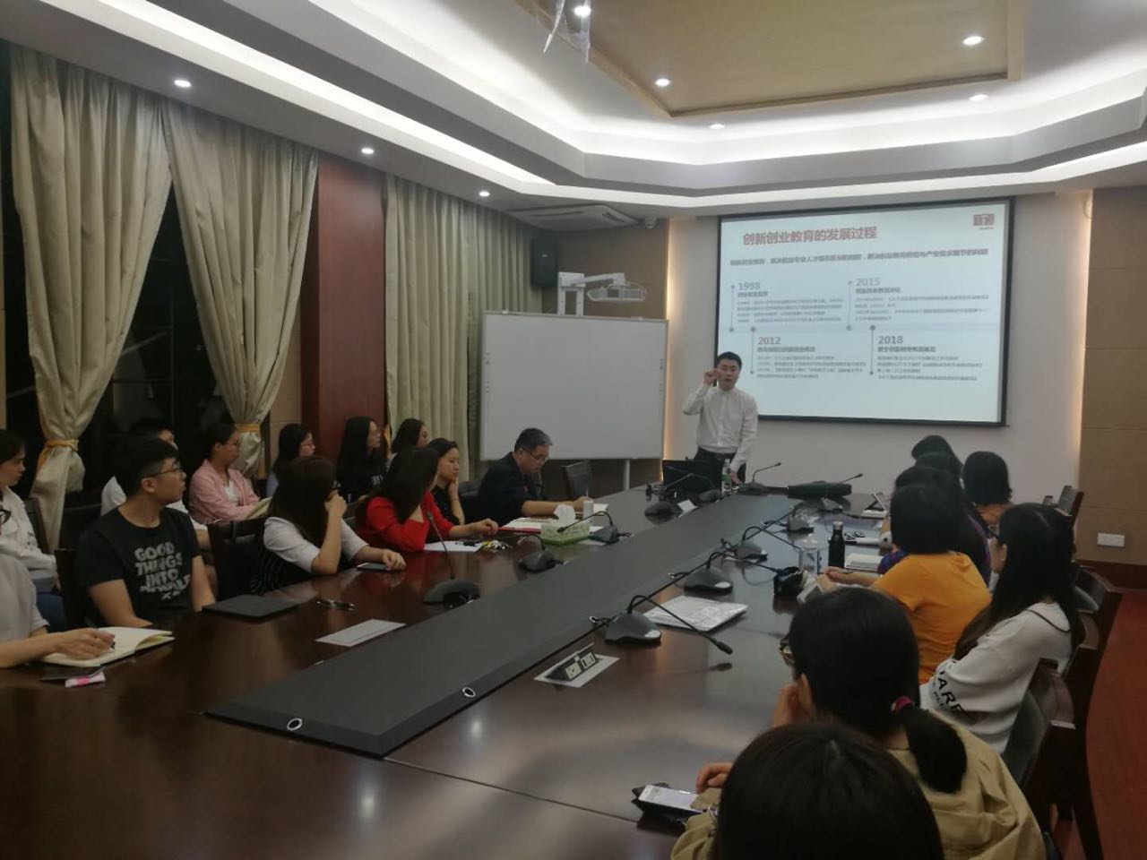 成忠老师详细讲解了我国创新创业教育的发展过程,特别强调了十九大后的我国的创新创业教育发展状况。他说:“目前,我国的创新创业教育正在从1.0迈向2.0,要完成这一转变,必须要使创新创业与思政教育、创新与创业、课堂教学与实践教学相结合,深化高等教育综合改革,激发大学生的创造力。”