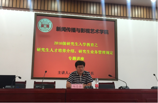 讲座伊始,向志强副院长对2016级研究生新生表示热烈的欢迎,还风趣地说到:研究生考试的社会热度虽远不及高考但却十分不易,在座的新生皆是传媒冉冉新生,活力无限,而千年学府百年名校为我们拥有了宝贵的资源与优良的学习环境,望学子共勉之、珍惜之、利用之。